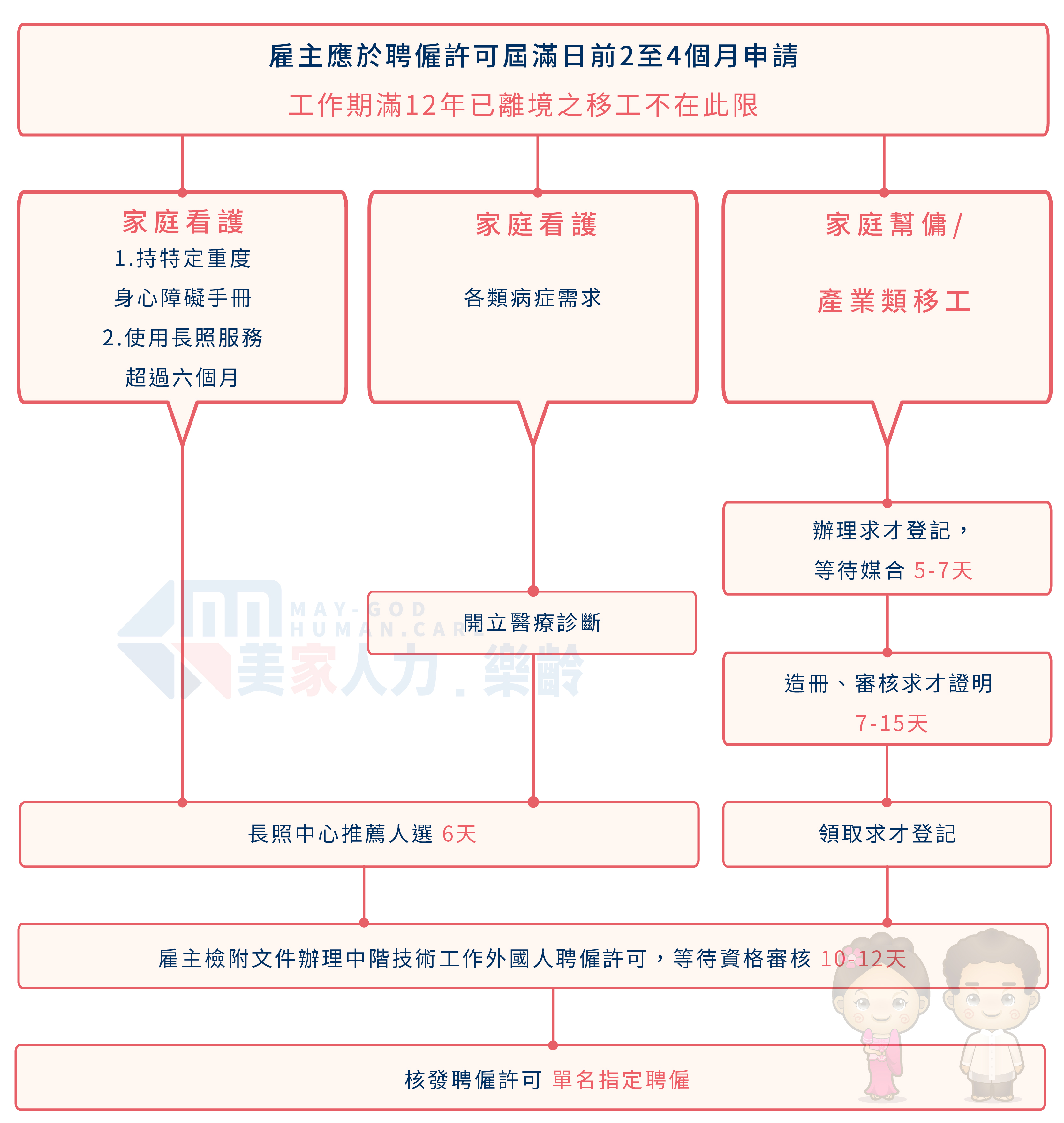 移工在臺工作有一定年限,美家人力為協助雇主留下熟練技術人才,辦理專門性或技術性外國人才留用,中階技術人力在臺無工作年限限制、薪資有所提升、技術更加精進,且無須繳納就業安定費,雇主可依需求留用所需人才,讓訓練完善的熟練技術人才得以保留。